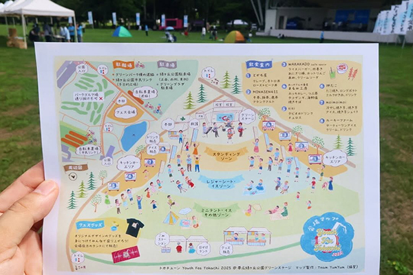 応援してます!十勝の高校生団体トカチューンが企画する夏フェス Youth Fes Tokachi 2025! フェスの熱気が届くよう、パンフレット裏面に会場マップを描かせていただきました。