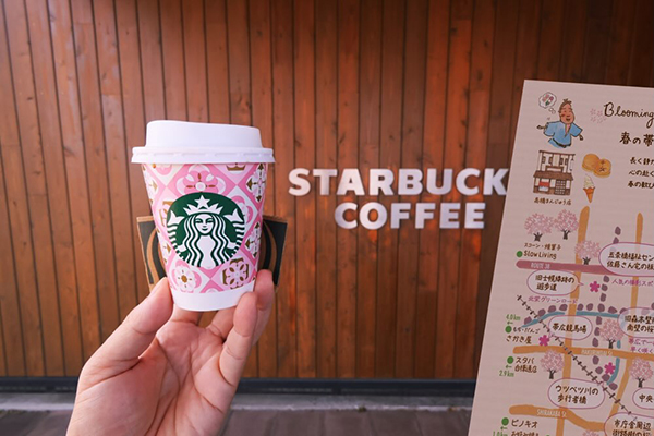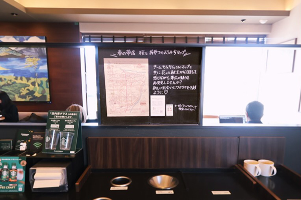 スターバックス白樺通り店では、コミュニティボードや地域活動への参加などを通して、帯広の魅力を発信中。 春のお散歩のお供にコーヒーやドリンクをどうぞ。